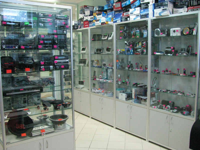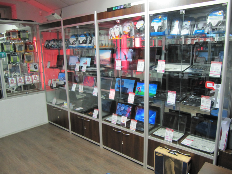 Основные изделия, применяемые для оформления магазинов с данным товарным сегментом это витрины, прилавки и стеллажи. Витрины могут быть изготовлены из различных материалов: алюминиевого профиля, ламинированного ДСП, МДФ, стекла и т.д. Наиболее актуальны для данного товара витрины из профиля. Они прочны, надежны и долговечны, хорошо сочетаются с техникой. Сам алюминиевый профиль в стандартном варианте имеет покрытие, напоминающее матовое серебро, он еще называется “анодированным”. Такой вариант отлично сочетается и с самим товаром и с прочими мебельными материалами. Преимуществом витрин и прилавков из профиля является тот факт, что внутри этот материал полый. Это значит, что в нем можно расположить всю электропроводку, исходящую от светильников, прикрепленных к полкам оборудования.
